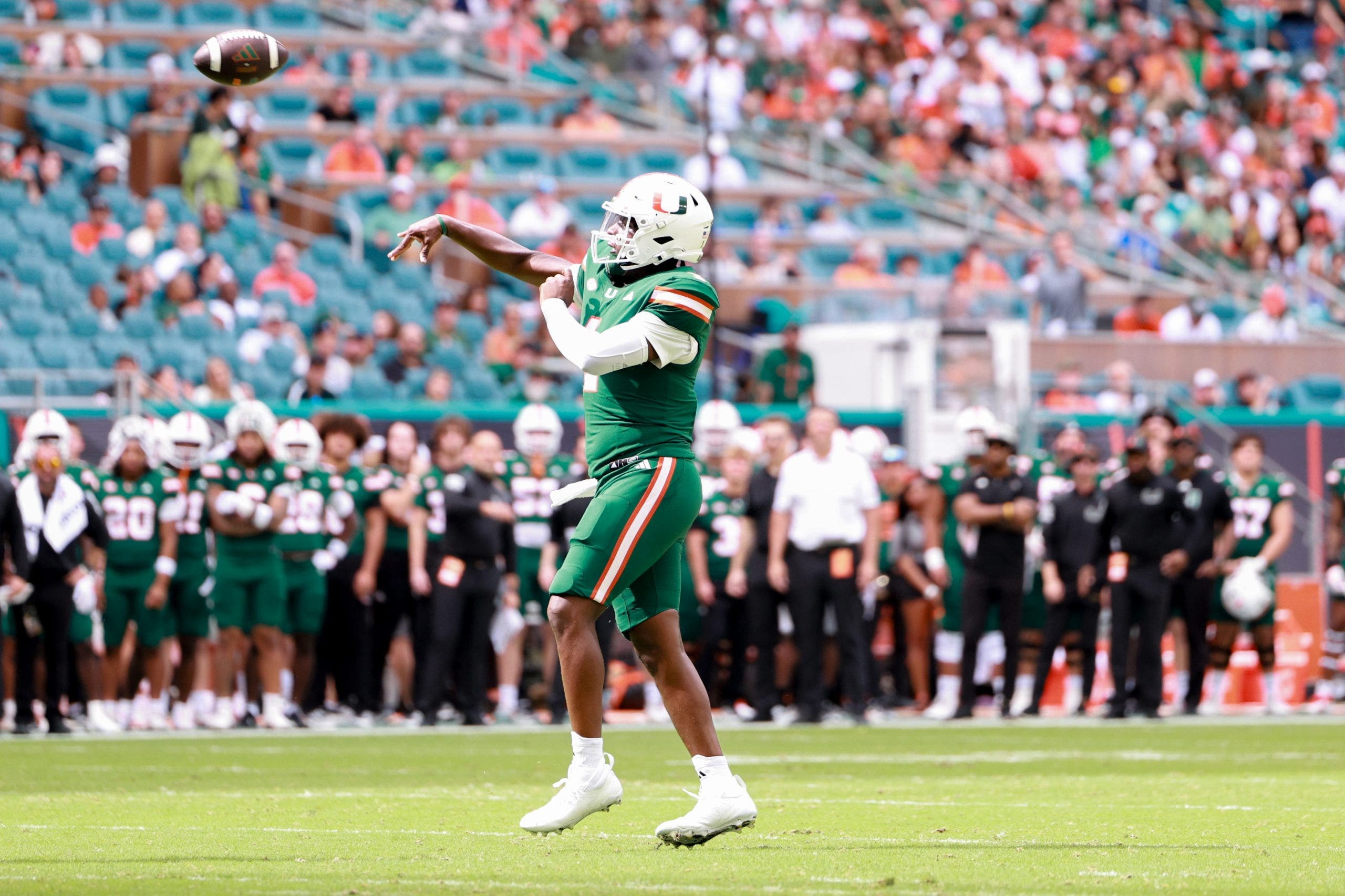 Miami QB Cam Ward threw for 400 yards and five touchdowns in the Hurricanes' win. (Photo by Carmen Mandato/Getty Images)