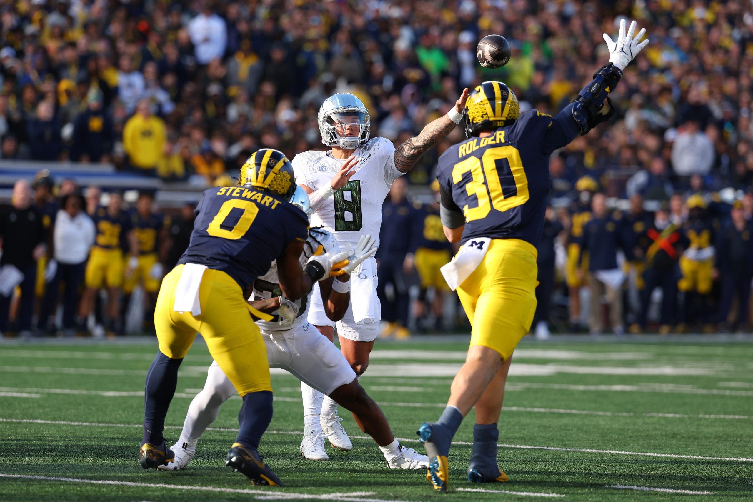 Oregon QB Dillon Gabriel threw for 294 yards and a touchdown in the Ducks' win over Michigan. (Photo by Gregory Shamus/Getty Images)